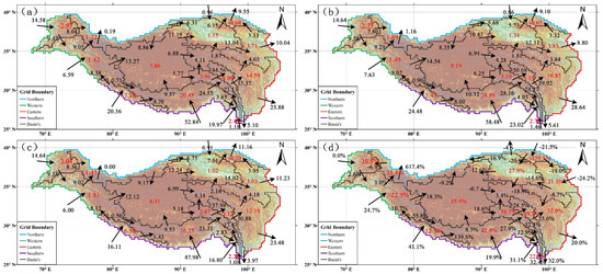 Distribution map of summer water vapor transport and budget on the TP, the arrow indicates the direction of water vapor flux, the black value is the net water vapor flux at the boundary of the basin, and the red value is the instantaneous WVB of the basin, unit: 106 kg s−1; (a) climatic state, (b) strong year, (c) weak years, and (d) proportion of the difference between strong and weak years.