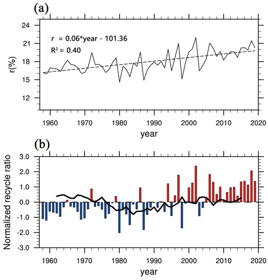 - Zhao, Y.; Zhou, T. Interannual Variability of Precipitation Recycle Ratio Over the Tibetan Plateau. J. Geophys. Res. Atmos. 2021, 126, e2020JD033733. [Google Scholar] [CrossRef]