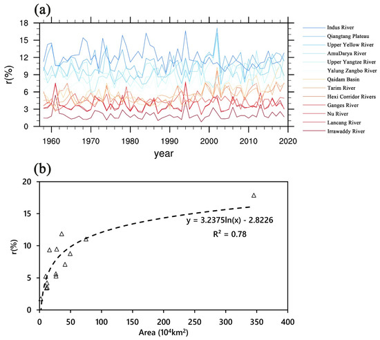 (a) Time series of PRRs in different basins of the TP. (b) The relationship the PRRs and the basin areas of the TP and its basins.