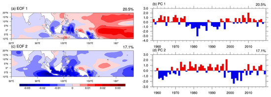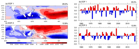 (a,b) The EOF1 and EOF2 of the detrended OLR in the IPWP. (c,d) The standardized time series of the PC1 and PC2, respectively.