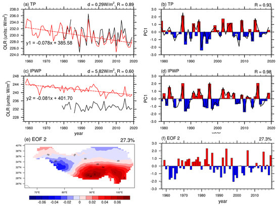 The climatology and trend of summer OLR over the (a) TP and (c) IPWP: the red solid and dotted lines denote the ERA5, and the black solid lines denote the HIRS OLR, respectively. The PC1 time series of EOF over the (b) TP and (d) IPWP: the bars denote the ERA5, and the black lines denote the HIRS OLR. (e,f) are the second mode and time series of the EOF2 for the detrended OLR over the TP.