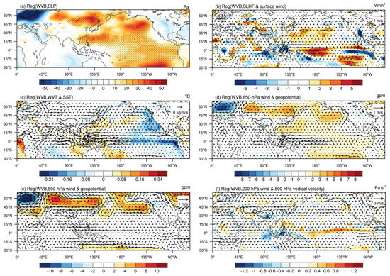 Anomalies of (a) the water vapor flux (vector, unit: kg m−1 s−1) and precipitation (colored shading, unit: mm d−1), (b) SLHF (colored shading, unit: W m−2), and sea surface wind field (vector, unit: m s−1) regressed on the detrended and standardized time series of summer WVB from 1958 to 2019.