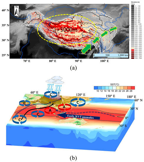 - Liu, Y.; Lu, M.; Yang, H.; Duan, A.; He, B.; Yang, S.; Wu, G. Land–atmosphere–ocean coupling associated with the Tibetan Plateau and its climate impacts. Natl. Sci. Rev. 2020, 7, 534–552. [Google Scholar] [CrossRef] [Green Version]