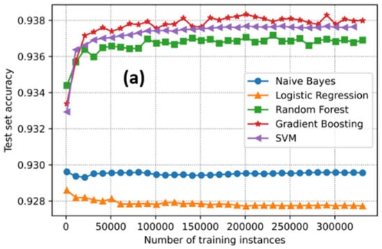 The performance evaluation of different training models: the relationship between the number of training instances and (a) the test set overall accuracy, (b) true positive rate (accuracy of sea water discrimination), and (c) true negative rate (accuracy of sea ice discrimination). The blue, orange, green, red, and purple marked-lines represent the results from Naive Bayes, logistic regression, random fore gradient boosting, and support vector machine (SVM) classification, respectively.