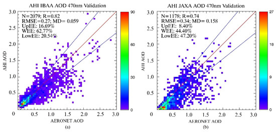 (a) The scatter plot of AHI IBAA AOD and AERONET AOD at 470 nm; (b) the scatter plot of AHI JAXA AOD and AERONET AOD at 470 nm. The color bars in (a) and (b) indicate the number of samples.
