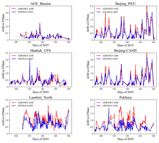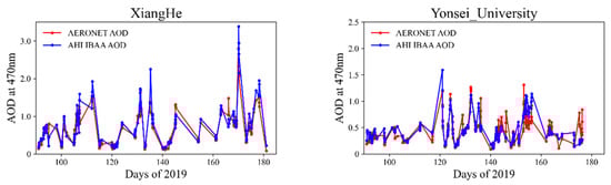 Variation curves of the hourly AOD (0.47 μm) from AHI IBAA and the AERONET product in eight AERONET stations during the study period. The red lines represent the matched AOD from AERONET and the blue lines are that from AHI.