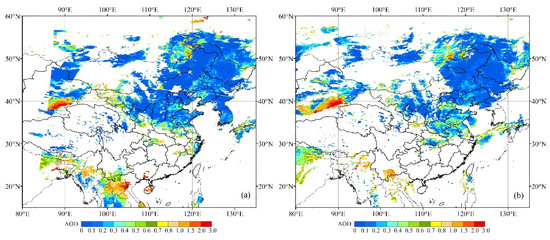 MODIS DB AOD on 2 May 2019 (a) for Terra-MODIS and (b) for Aqua-MODIS.