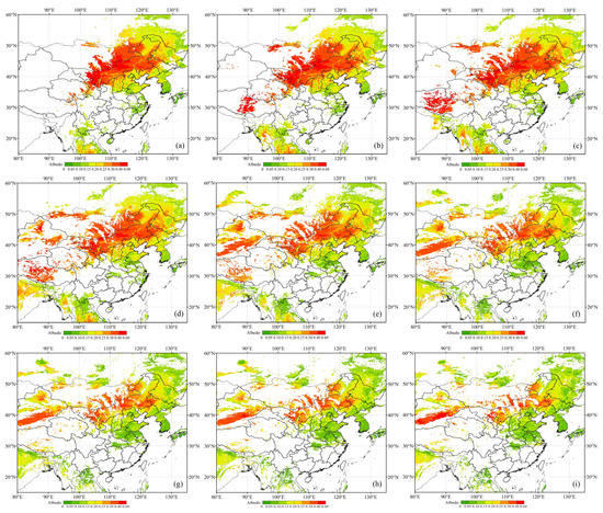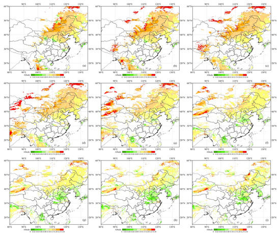 AHI-retrieved surface albedo at 0.47 μm on 2 May 2019. (a–i) Hourly albedo from 00:00 UTC to 08:00 UTC, respectively.