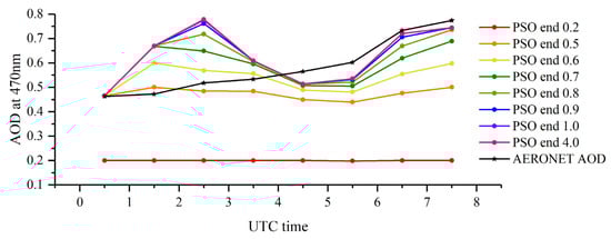 First, in order to test the PSO capability of global optimization and the suitability of the AOD inversion range setting, we selected the observations over the Beijing-CAMS site on 3 April 2019 for analysis. AHI observations are available for AOD inversion from 00:00 UTC to 08:00 UTC on this day. Through changing the value of the upper boundary of the AOD range, we found that as the upper boundary increases, IBAA AODs are close to the final retrieval results and remain unchanged when the upper boundary is greater than 1 as illustrated in Figure 11. Here, the upper limit calculated according to MODIS AOD is 1.77 and it completely satisfies the condition of obtaining a global optimal solution by PSO. Because the initialization of particles is random and the AOD result is stable, there is no need to worry that the algorithm will enter a local optimal solution. In addition, the boundaries of the AOD range in the paper are reasonable and almost all IBAA AODs are within the set range.