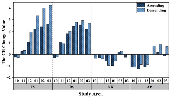 The monthly CR value difference between each month of 2019 snow season (October 2019–March 2020) and September 2019 for the ascending and descending orbits at the four typical study areas.