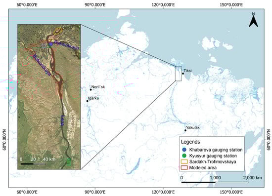 Our aim is to monitor the spring flood in Lena Delta; however, performing hydrodynamic modeling for the entire delta (32,000 km2 [] in size) requires extremely heavy computational work. Therefore, in this study, as a test site, we focus on a subset of Lena Delta where the river branches off to four major tributaries as seen in the inset map in Figure 1. The study site consists of a braided river system—a common river system on wetlands—flowing northwards that includes the Lena Reach, the Bulkurskaya Reach, and the Bykovskaya Reach, enclaved by cliffs on its east and west side. The area in red lines in Figure 1 indicates the selected area for the hydrodynamic modeling, which is 1561 km2 in size and 93 km in length. The green dot shows the gauging station in Kyusyur that recorded the water discharge 124.65 km upstream of the modeled area. Another gauging station located on Bykovskaya Reach (marked with the blue dot) recorded the surface water level. The area in orange lines downstream of the simulated area is the location where a river morphology study was conducted—between Sardakh and Trofimovskaya Islands—by Fedorova et al. [], which was used as the base of our bathymetry estimation. The Lena Delta riverbank sediments mainly consist of yedoma—fine-grained materials rich in organics and ice—which are common in Siberia []. The surrounding land surfaces consist of tundra and non-vegetated plains (sand and rock) [,]. The spring flood inundates the low floodplains and the shallow gullies that are usually dry in the other months.