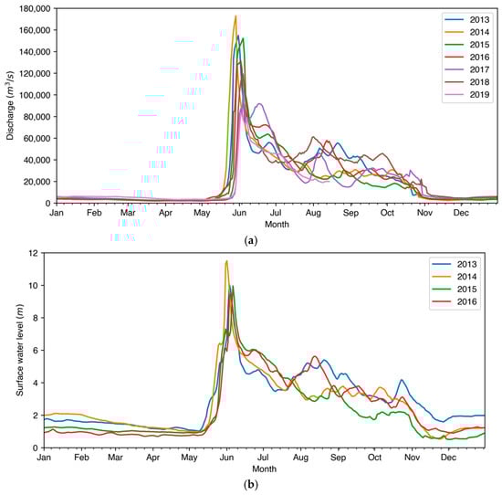 (a) The average daily river discharge recorded in Kyusyur in 2013–2019; (b) the average daily surface water level recorded in Khabarova in 2013–2016.