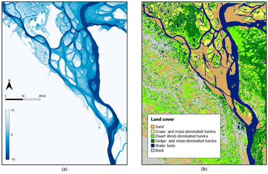 (a) The estimated bathymetry, trapezoidal channels with maximum depth of 10 m—terrains higher than 10 m are irrelevant to the simulation, therefore not shown; (b) land cover map of the Lena Delta study area (mosaicked from the TSX/TDX-RE and LS8 classification results).