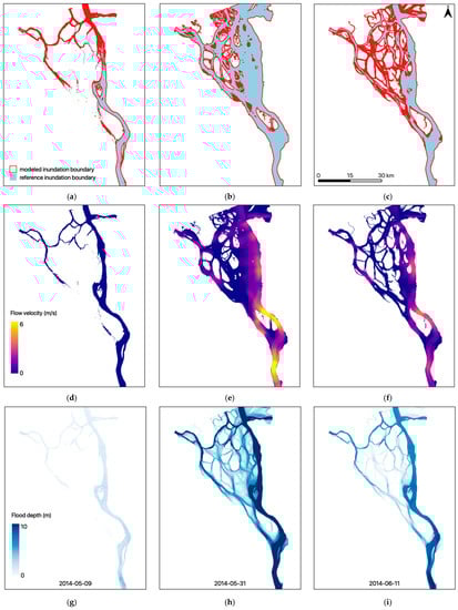 (a–c) Modeled inundation boundaries (in light blue) and TSX/TDX-derived reference inundation areas (red borders), (d–f) modeled flow velocities, and (g–i) modeled depths before the flood (early May, left column, upstream discharge 2280 m3/s, inundation area 300.71 km2), during the flood peak (late May, middle column, upstream discharge 173,000 m3/s, inundation area 1118.71 km2), and after the flood (mid-June, right column, upstream discharge 62,400 m3/s, inundation area 726.73 km2) of the 2014 spring flood event.