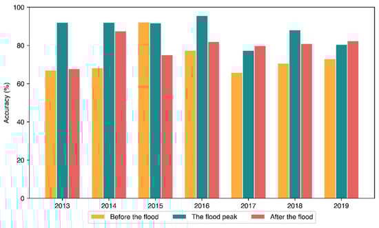 The accuracy scores (true positives in %) of the three modeled stages of the 2013–2019 flood events.