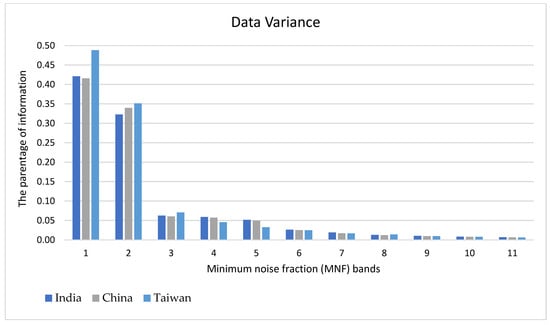 Visual illustration of the MNF bands’ data variance for the satellite images of each case study. Y-axes on the left and right sides of the graph show the parentage of information in each MNF band, and X-axis is the MNF bands.