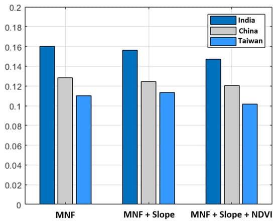 Figure 8, Figure 9 and Figure 10 represent the reconstructed deep features based on a stack of MNF features, slope, and NDVI layers of case studies in India, China, and Taiwan, respectively. In addition, Figure 11 shows the minimum and maximum values for each deep feature of different case studies.