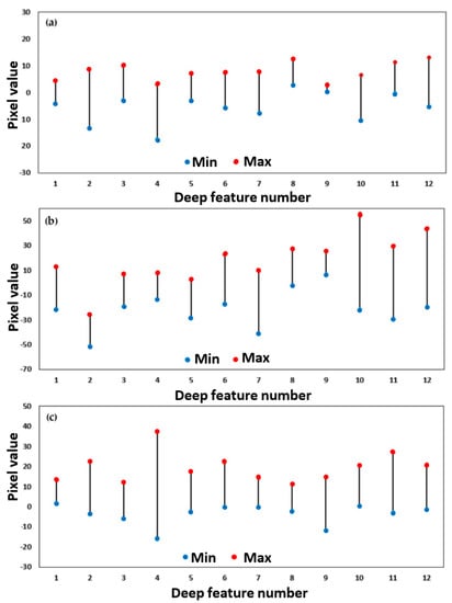 Pixel values range of reconstructed deep features of case studies in India (a), China (b), and Taiwan (c). Numbers 1–12 indicate the number of image features.