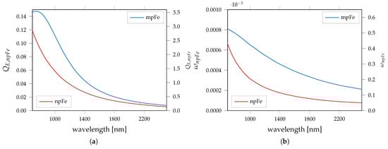 Extinction efficiencies and SSA spectra of the space weathering components npFe0 and mpFe0 calculated according to Wohlfarth et al. []. (a) Extinction efficiencies ; (b) SSA.