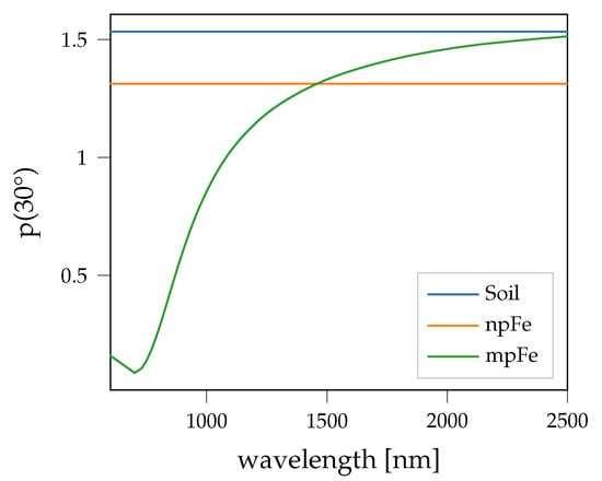 The phase function of a mixture is also defined by the weighted sum of the phase functions of the components. The phase functions of the soil and the small npFe0 particles are independent of wavelength, but the larger mpFe0 particles have a wavelength dependent phase function (see also Figure 2), which is, therefore, given as a vector.