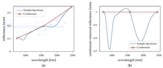 Example calculation of the continuum removed spectrum for endmember AG-TJM-009 from the RELAB database space weathered with 1.5 wt.% npFe0 and 0.8 wt.% mpFe. The continuum is calculated as the linear interpolation between the reflectance factor at 730.48 nm, 1578.86 nm and 2497.11 nm. These channels usually lie outside the absorption bands. (a) Reflectance spectrum; (b) continuum removed spectrum.
