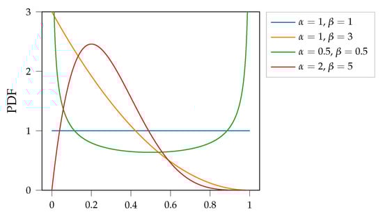 Bayesian inference offers a convenient way to include a-priori knowledge in the sampling process. As described in Equation (11), the posterior is proportional to the likelihood and the prior . For multiple priors, the joint probability is given by the product of the individual probability. Because our parameters are usually limited to the interval of [0, 1], a good choice for the priors on our parameters is the Beta distribution, which is defined by two shape parameters and as follows []: