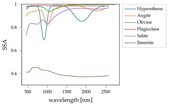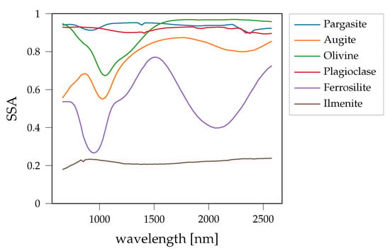 We selected the endmembers according to the categorizations above (see Section 2.1.4). A representative of each of the classes LCP, HCP Type A, HCP Type B, Olivine, Plagioclase, and Ilmenite is selected from the RELAB catalog (https://pds-geosciences.wustl.edu/spectrallibrary/default.htm, accessed on 1 November 2020) and the SSA values are obtained by inverting the Hapke model and displayed in Figure 5. All endmembers are samples of the 0–45 m size fraction. The elemental abundances of the endmembers are listed in Table A1.
