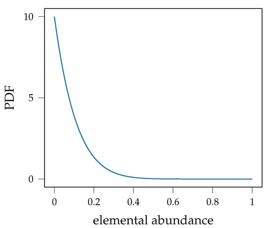 The mixtures are synthetically generated, such that we set to prefer solutions where the sum of the fractional abundances is close to one. The experiment is carried out once with no prior on the elemental abundances and once with an elemental prior on the abundances of TiO2 and Al2O3 (see also Table 2). For theoretical abundances below 1 wt.% the variance becomes very low when using the method mentioned above. Therefore, we set and for the shape of the prior, making the mode zero and the PDF is given in Figure 6.