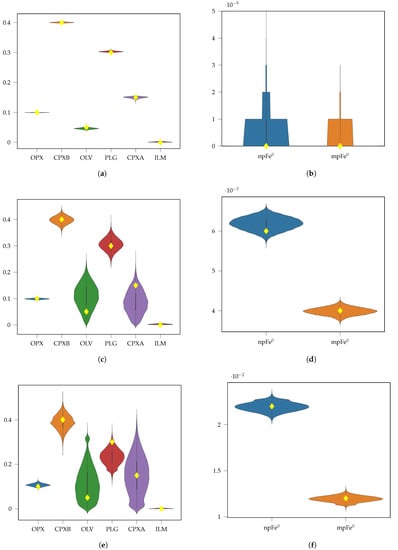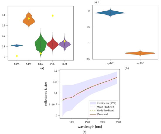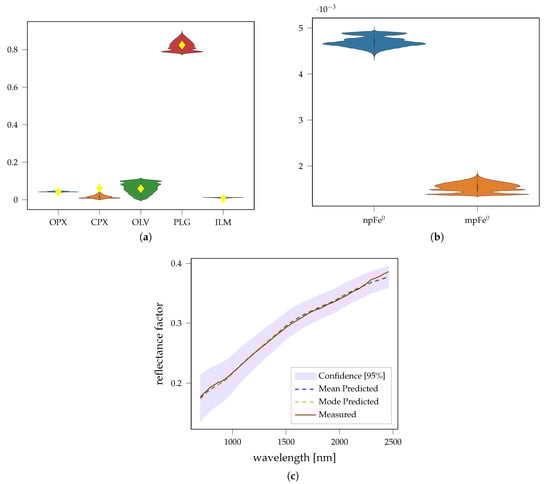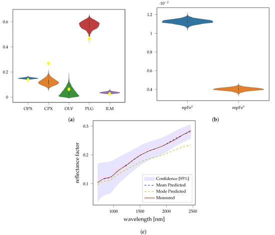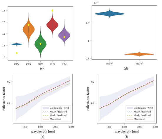 In general, we set the shape parameters for npFe0 and mpFe0 to and . These parameters were tuned by hand such that 80% of the probability density is distributed in the interval [0 wt.%, 5 wt.%]. Higher values than 5% are physically implausible. Trang and Lucey [] found about 2 wt.% of smFe at the maximum for the Moon, excluding the polar regions. The model of Trang and Lucey [], first versions of which were introduced in Trang et al. [] and Lucey and Riner [], differs from the model of Wohlfarth et al. [], for example, Trang et al. [] do not consider the influence of the phase function. Therefore, the predicted concentration of npFe0 and mpFe0 is not necessarily the same, leading us to set a relatively uninformative prior on each of the smFe abundances. The prior on the abundance of smFe particles is consistent throughout this work and is not changed between experiments.