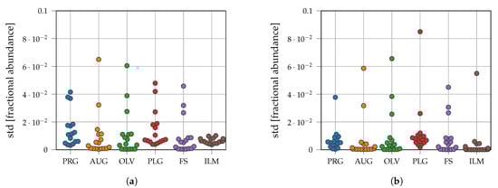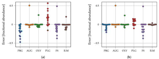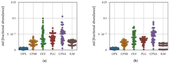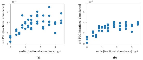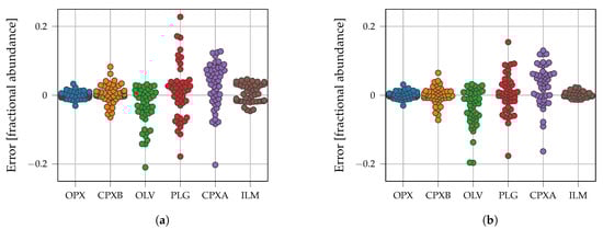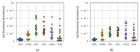The RELAB database provides elemental abundances for many of the samples (e.g., []) and the elemental composition of the endmembers from Rommel et al. [] were determined by electron microprobe analysis. We here use endmembers with well-defined elemental abundances (, matrix, for M elemental abundances and N endmembers) and use the estimated elemental abundances of the samples (, ) as prior information. If the samples are mixed directly from the endmembers with weights () the actual elemental abundances can be calculated as
