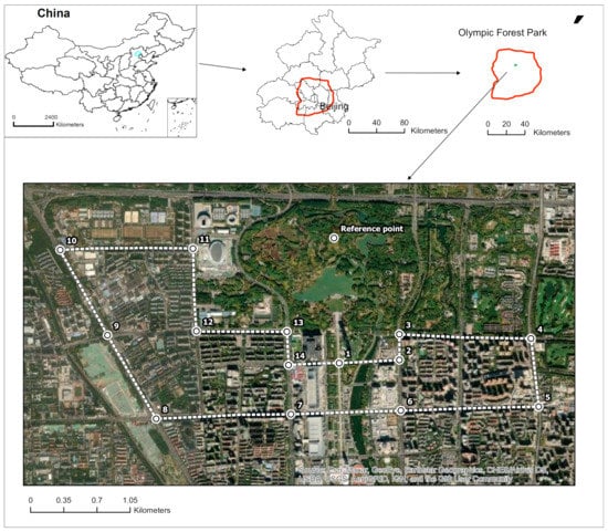 Spatial location of measurement points (1, 2, 3, …, 14) and the reference point at the center of Beijing Olympic Forest Park.
