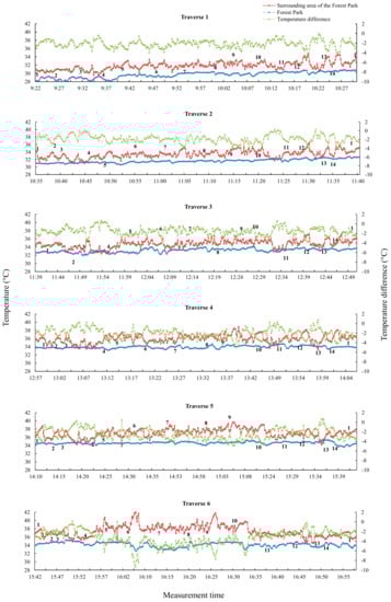 The air temperature variation trend in the center of Olympic Forest Park and the measurement route on 10 July 2017. Temperature (T) difference: T Park—T measurement point. The numbers on the charts area stand for the measurement point’s number.