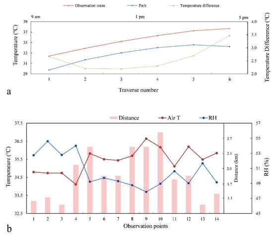 The comparison of the average air temperature difference between the Olympic Forest Park and the measurement route in the surrounding area of the park (a), and distribution pattern of air temperature, RH and distance to park of measurement points (b). Temperature (T) difference: average T of each traverse—corresponding T of park (average values of 6 traverses on 10 July 2017).