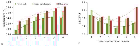 Average air temperature (a) and standard deviation of air temperature values (b) of the forest park (reference point), points on forest park’s borders (1, 2, 3, 4 and 13) and points far from the park (5, 6, 7, 8, 9 and 10), during 6 traverses on 10 July 2017 (see Figure 1 for the spatial location of points).
