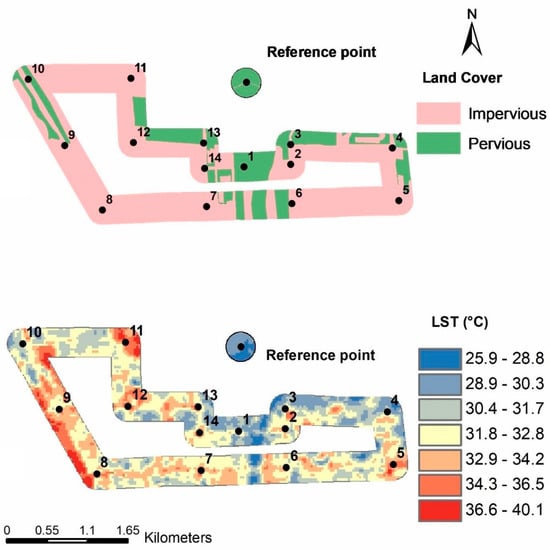 The measurements were taken along a route of 14.6 km passing along the edge of the park and surrounding urban areas with an average 2.5 km distance to the center of the park, which was determined as our reference point (Figure 1). The reference point was on a small paved road to avoid the influence of shadows from trees. The measurement route was chosen on the south side of the forest park as this area is flat, thus temperature variations due to topographical differences are small and can be ignored, and we could choose the streets with similar width and traffic flow to minimize the impact of traffic and anthropogenic activities on data. Further considerations are presented in Section 4.6 (limitations). All temperature measurements were made in the middle of the paved streets to avoid shade from buildings and trees. Fourteen points (1, 2, 3, … 14) were chosen on the route and used for spatial comparison and for investigating the relationship between characteristics of each location and air and surface temperature. The points were sufficiently close to one another to be affected by uniform meso-scale weather conditions; however, they were each affected by distinctly heterogeneous micro-scale landscape features. Table 1 describes the landscape feature of each point.