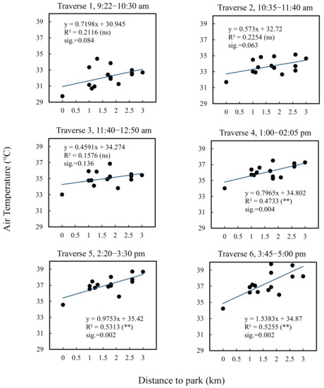 The cooling effect of urban greenery not only lowers the temperature in the green patches, but it can also extend to the surrounding area and thus generate a better overall thermal comfort. However, our results show that the measurement points with lesser distance to the park were cooler. We found that, on average, the temperature tends to increase by approximately 0.8 °C for every 1 km increase in distance. Huang et al. [56] reported a 0.4 °C/km air temperature reduction in Nanjing, China; also, a surface temperature drop of 0.15 °C/km in Beijing, China [42] and 3.89 °C/km in Delhi, India [57] has been observed. Different values of temperature reduction gradient might be related to using different measuring methods, climate background and the category of temperature [58]. However, this basic pattern is supported by others, although with different interpretations. Hamada and Ohta [34] studied an urban park in Japan with an area of 147 ha and suggested that the cooling impact of the park can extend for several hundred meters. According to [35], the cooling impact extends into the surrounding area with a distance comparable to the length of the park. Consistent with that finding, [14,23] suggest that the cooling range is linked to the size of the park. As seen in the regression analysis, the influence of distance on temperature was stronger in the afternoon (traverses 5 and 6) than in the middle of the day and in the morning. This could be because of the greater temperature difference between the park and the surrounding area in the afternoon, which is conducive to the diffusion of the park’s cooling effect into the surrounding built environment [12]. Our results underscore the importance of lowering the distance to urban parks or constructing more urban parks.