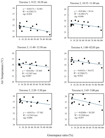 The slopes of linear regressions between air temperature and green space ratio for the measurement points (* p < 0.01, N = 15, sig.: 2-tailed significance, data of 10 July 2017).