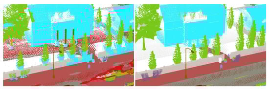 We fixed similar training parameters between both baselines (Pointnet++ [29] and KPConv [30]) in order to compare their performance. As pre-processing, point clouds are sub-sampled on a grid, keeping one point per voxel (voxel size of 6 cm). Models learn, validate, and test with these data. Then, when testing, we perform inference with the under-sampled point clouds and then give the labels in “full resolution” with a KNN of the probabilities (not the labels). Spheres were computed in pre-processing (before the training stage) in order to reduce the computational cost. During training, we selected the spheres by class (class of the center point of the sphere) so that the network considered all the classes at each epoch, which greatly reduces the problem of class imbalance of the dataset. At each epoch, we took one point cloud from the dataset ( for CARLA and for Paris) and set the number of spheres seen in this point cloud to 100.