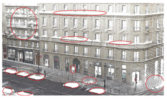 For the Paris data, the point clouds can be divided into two groups: those near the Luxembourg Garden with vegetation and wide roads ( and ), and those in a more dense urban configuration with buildings on both sides (, , and ).