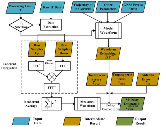 The aircraft’s altitude was about 3 km during the experiment, and the velocity was about 50 m/s. The direct and reflected signals are captured by the 8-element phased array antennas of RHCP (right-handed circular polarization) and LHCP (left HCP) respectively. The radiofrequency (RF) signals received by the antenna elements are filtered, amplified, and down-converted into IF signals. The IF signals are quantized by a comparator, and the quantized signals are connected to a field-programmable gate array (FPGA) through D-type flip-flops whose parallel processing capability is used for sampling. Analogue signals received by an element are quantized into one-bit in-phase components and one-bit quadrature components per sample. The sampling frequency is 80 MHz. Finally, the sampled digital signal is transmitted into the ground receiving station through the PCIe bus [23]. The acquired data is processed by a software-defined receiver. A simplified diagram of data processing and altimetry retrieval is depicted in Figure 1.