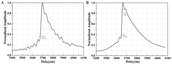 where is the delay corresponding to the maximum of the measured waveform’s first derivative (Figure 2A), and and correspond to the nominal SP delay and the maximum of the simulated waveform’s first derivative. The nominal SP is the minimum of the reflection path calculated from the WGS-84 reference coordinate when the positions of the transmitter and the receiver are known. The simulated waveform (Figure 2B) is generated according to the Zavorotny and Voronovich (Z-V) model, which takes into account the influence of geometry, instrument configuration, and ocean state [26]. The difference between and obtained from the simulated waveform is used as the deviation correction for DER tracking.