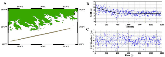 Experimental area and IF data processing results. (A) The specular points tracks of the raw IF data. (B) Measured SSH relative to the WGS84 reference ellipsoid. (C) SSH residual after subtracting the fitted value.