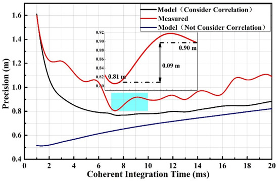 A comparison between the variance of the model and the measured result is shown in Figure 5. To evaluate the effectiveness of the model, the mean deviation of precision is used. is the precision calculated by the model, whereas is the measured precision. The results show that the average deviation between the red and blue curves is 0.85 m, and the average deviation between the red and black curves is 0.16 m. Therefore, the proposed model considering the correlation of the waveforms is in good agreement with the measured result.
