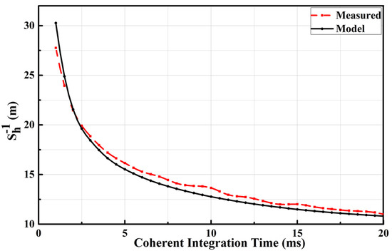 The reciprocal of the altimetric sensitivity simulation is compared with the measured result, as shown in Figure 6. It can be appreciated that the measured and the simulated curves are in good agreement. As the coherent integration time increases, the reciprocal of the sensitivity approaches a limit value. The difference between the curves may be caused by unaccounted noises [33,34].