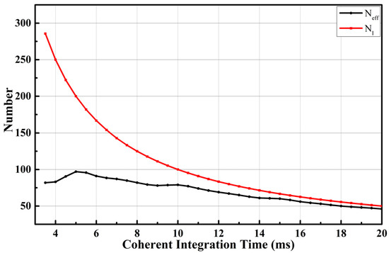 As discussed in Equation (15), the effective incoherent average at the SP is closely related to the waveform correlation [32]. Therefore, when the processing time of the incoherent average power waveform is , the variation of with the coherent integration time can be approximated following Appendix B as: