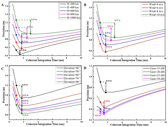 The simulation variation curves of the estimated altimetric precision with the coherent integration time under different conditions. (A) When the wind speed is 6 m/s, the elevation is 60°, the antenna gain is 15 dBi, and the orbit altitude varies. (B) When the orbit altitude is 600 km, the elevation is 60°, the antenna gain is 15 dBi, and the wind speed varies. (C) When the orbit altitude is 600 km, the wind speed is 6 m/s, the antenna gain is 15 dBi, and the elevation varies. (D) When the orbit altitude is 600 km, the wind speed is 6 m/s, the elevation is 60°, and the antenna gain varies.