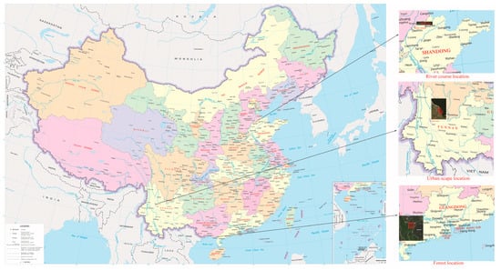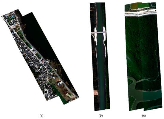 As shown in Figure 2, the locations of the study areas are labelled using the red polygon. The urban scape area (960 m∗300 m) is a place near Erhai lake in Yunnan Province which is located in the southwest of China. When collecting the hyperspectral images, the UAV flight height is set at 200 m. From Figure 3a, it shows that the urban scape area is composed of buildings, roads, trees, farmland and a lake; it is easy to extract multiple high-precision tie points for image mosaicking, so the side overlap rate is set as 30%. The river course (1100 m∗68 m) is a part of Zhang wei xin river in DeZhou distinct of Shandong Province, which is located in the east of China, the flight height is set as 120m. The area is dominated by water (Figure 3b) where the spectral reflectance is homogeneous so it is difficult to find enough high-precision tie points. Moreover, the width of the river course is about 76% of the width of image strip; therefore, the side overlap rate was set at 50% to make sure there exist some distinct feature points that can be used in image registration. The forest area (570 m∗135 m) is an area that is located in Zhan jiang mangrove forest protection area in Guang dong Province, which is located in the south of China. As shown in Figure 3c, it is representative of mangrove, riparian plants and water. To get a high spatial resolution image for mangrove forest monitoring, the flight height is set as 90 m, so the coverage of each image strip is relatively small. In this situation, the side overlap rate was set at 20% to improve the data collection efficiency.