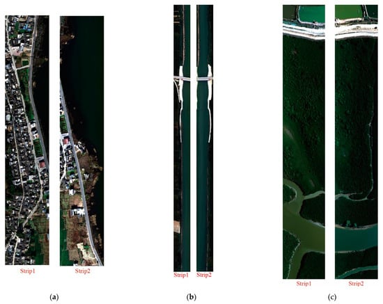 True color images of two neighboring image strips (bands of 103, 63 and 27): (a) Urban scape; (b) River course; (c) Forest.
