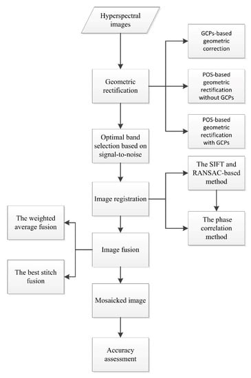 The focus of this study is on the processing of the push-broom hyperspectral UAV images to acquire a seamless image that has a high geometric accuracy and spectral fidelity. A practical image mosaicking chain of methods that are applicable to different types of land surfaces was proposed. Several methods for image rectification, image registration and image fusion were compared and assessed by using a new set of UAV data acquired in urban scape, river course and forest areas in experiments. Results show that the proposed image mosaicking methodology can not only produce a hyperspectral image with a high image geometrical accuracy but also ensure the spectral fidelity before and after image mosaicking. The following paper is organized as follows: Section 2 introduces the data acquisition and preprocessing principles of the UAV-mounted hyperspectral imagery used in this study and proposes the image mosaicking methodology with comprehensive processing steps including geometric rectification, image registration and fusion. Section 3 presents experimental results and discusses the best strategy for each study area. Section 4 draws conclusions and proposes future work.