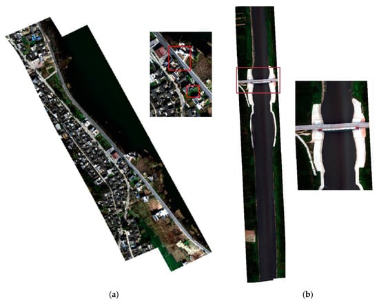 The reflectance data of the urban scape, river course and forest area are shown in Figure 3a,b. The data size of Urban scape, river course and forest area is 2.6, 6.81 and 3.06 Gigabytes respectively. After the preprocessing of UAV hyperspectral images, the distortion that occurs in the push-broom sensor’s scanning procedure along the flight line can be mostly reduced because a gimbal was used in the whole data capture process. However, there are still scale, rotation and translation distortions between the narrow overlapped image strips as shown in Figure 3.